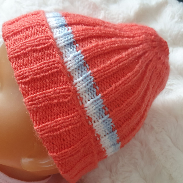 Handgebreid babymutsje in oranje met strepen.