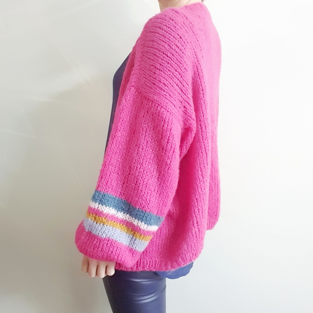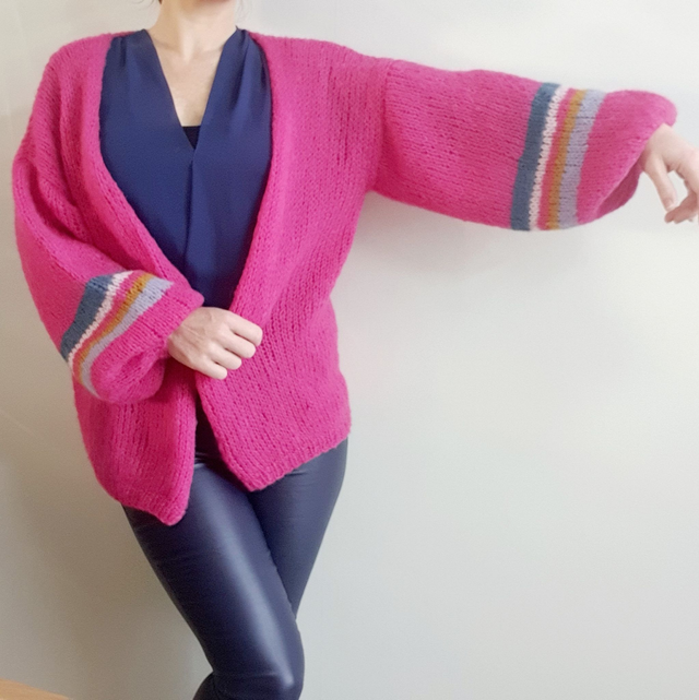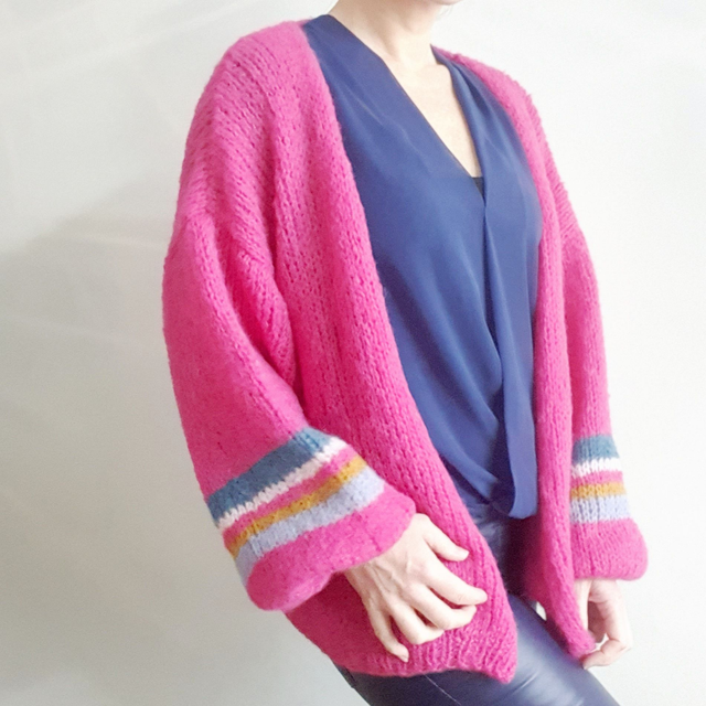 De ballonmouwen hebben een streepaccent in denimblauw, lila en kerriegeel.