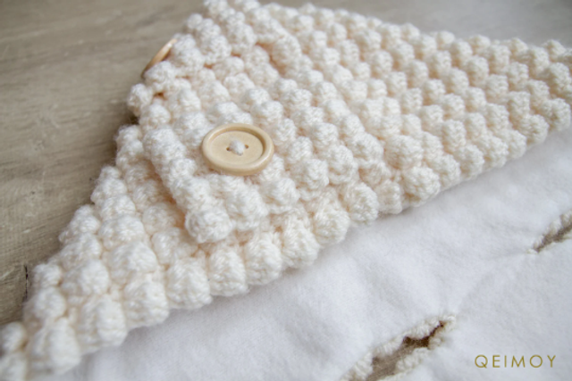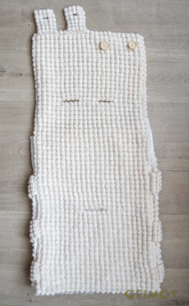 Buitenzijde gehaakt van acrylgaren. Binnenzijde gevoerd met zachte fleece. Het mutsje en 2 zijden kun je met knopen openen en sluiten. Over de bovenrand van het dekje is de fleece voering ook als omslag uitgevoerd.