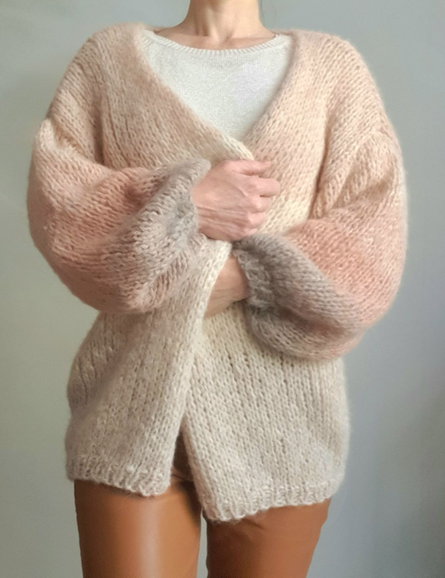 Lang handgebreid luxe damesvest in alpaca en zijde met ballonmouw
