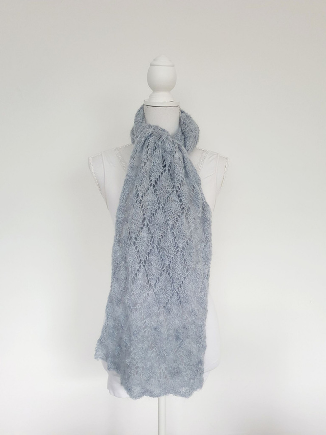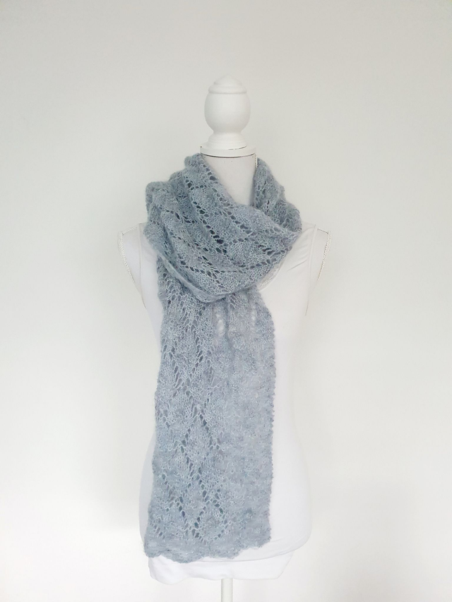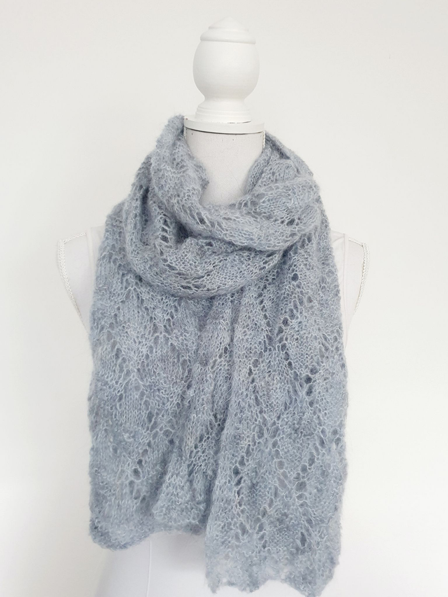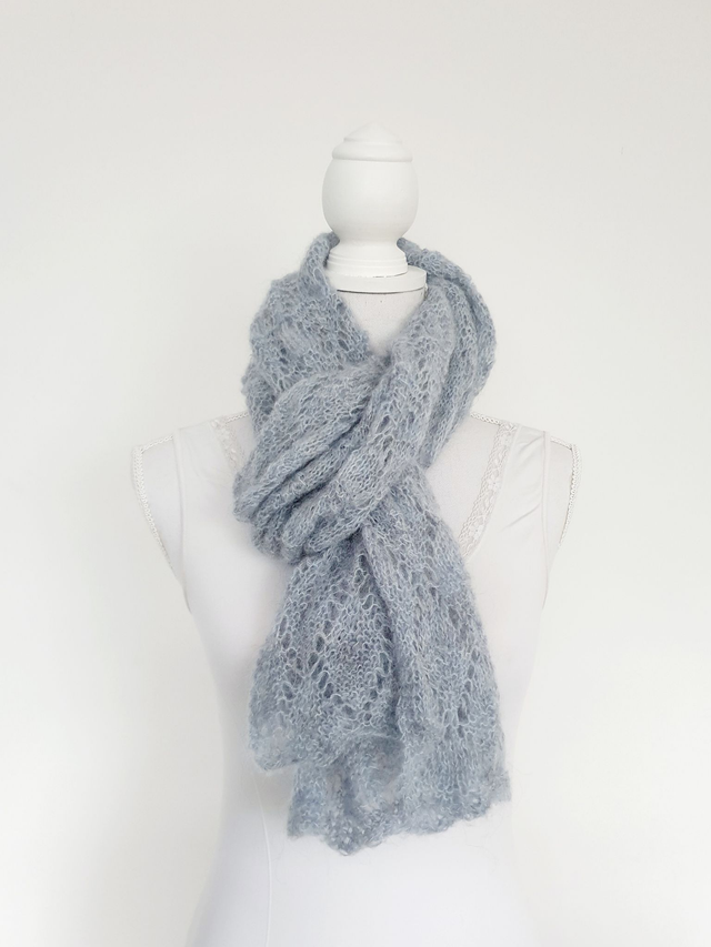Wat een juweeltje van een sjaal is dit geworden! Zacht, een teer en fijn kantpatroon, en een zachte blauwgrijze gemêleerde kleur. Handgebreid, ouderwets maar helemaal on-trend op de breipennen. En van exclusief garen: een blend van mohair, scheerwol en polyamide. Een sieraad om je hals en een prachtige aanvulling op je outfit. Draag hem op allerlei verschillende manieren en kom steeds weer net iets anders voor de dag met dit fijne, luchtige en luxe handwerk.