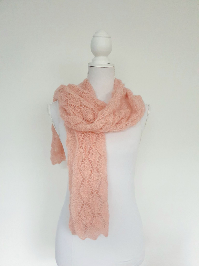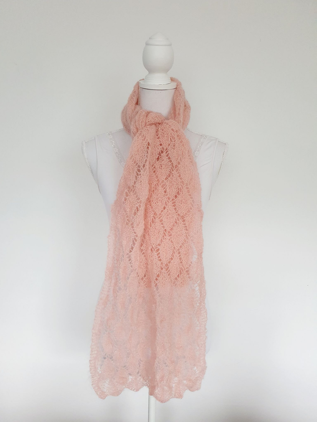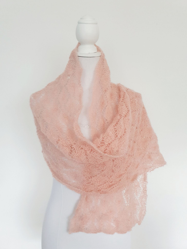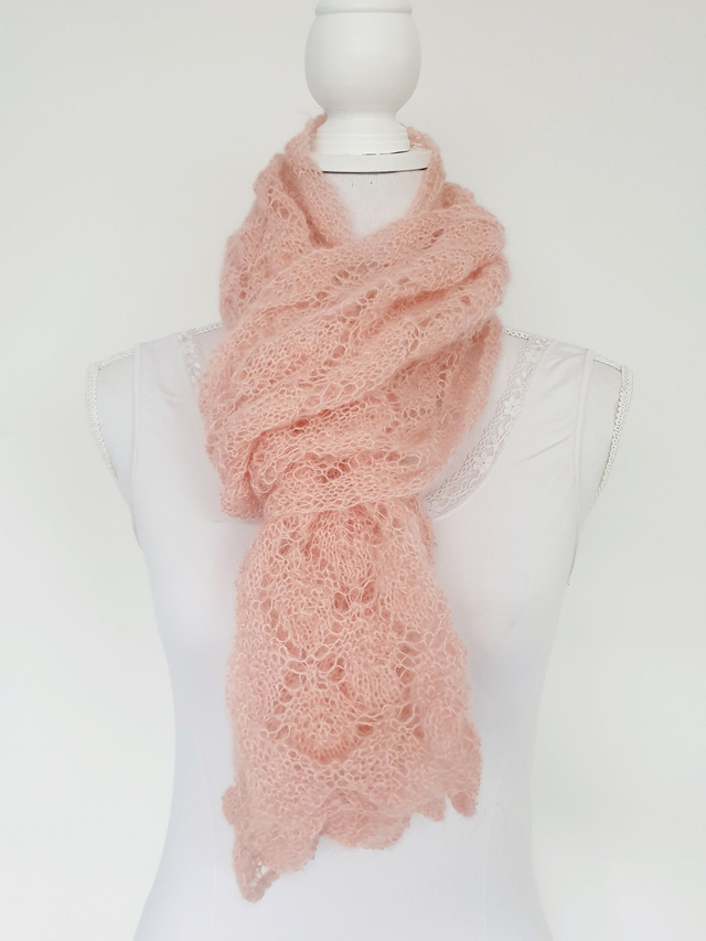 Handwerk en kantwerk! Deze zachte pastelroze sjaal is ouderwets gebreid met de hand in een teer en fijn kantpatroon. Het garen is een blend van mohair, wol en acryl. Kijk bij de foto's voor stylingideeën en kom steeds weer net iets anders voor de dag met dit fijne, luchtige en luxe handwerk.